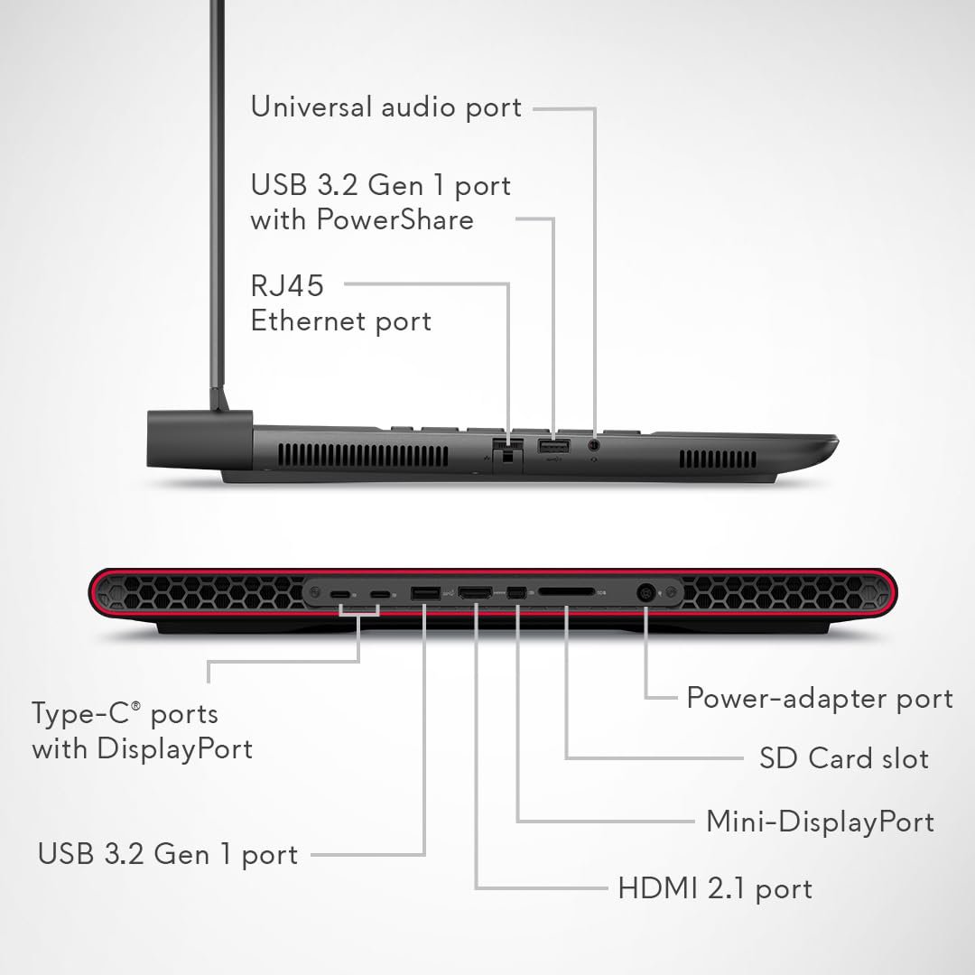 Ports: (1x) RJ-45, (1x) Global headset jack, (1x) Type-A USB 3.2 Gen 1 Port with PowerShare, (1x) Power/DC-in Port, (2x) Type-C (Thunderbolt 4.0 , USB 4 Gen 2, 15W (3A/5V) Power Delivery and DisplayPort 1.4) Port, (1x) Type-A USB 3.2 Gen 1 Port, (1x) HDMI 2.1 Output Port, (1x) mini-DisplayPort, (1x) SD Card slot // Primary Battery: 6 Cell, 86 Wh, integrated power 330W Small Form Factor adapter