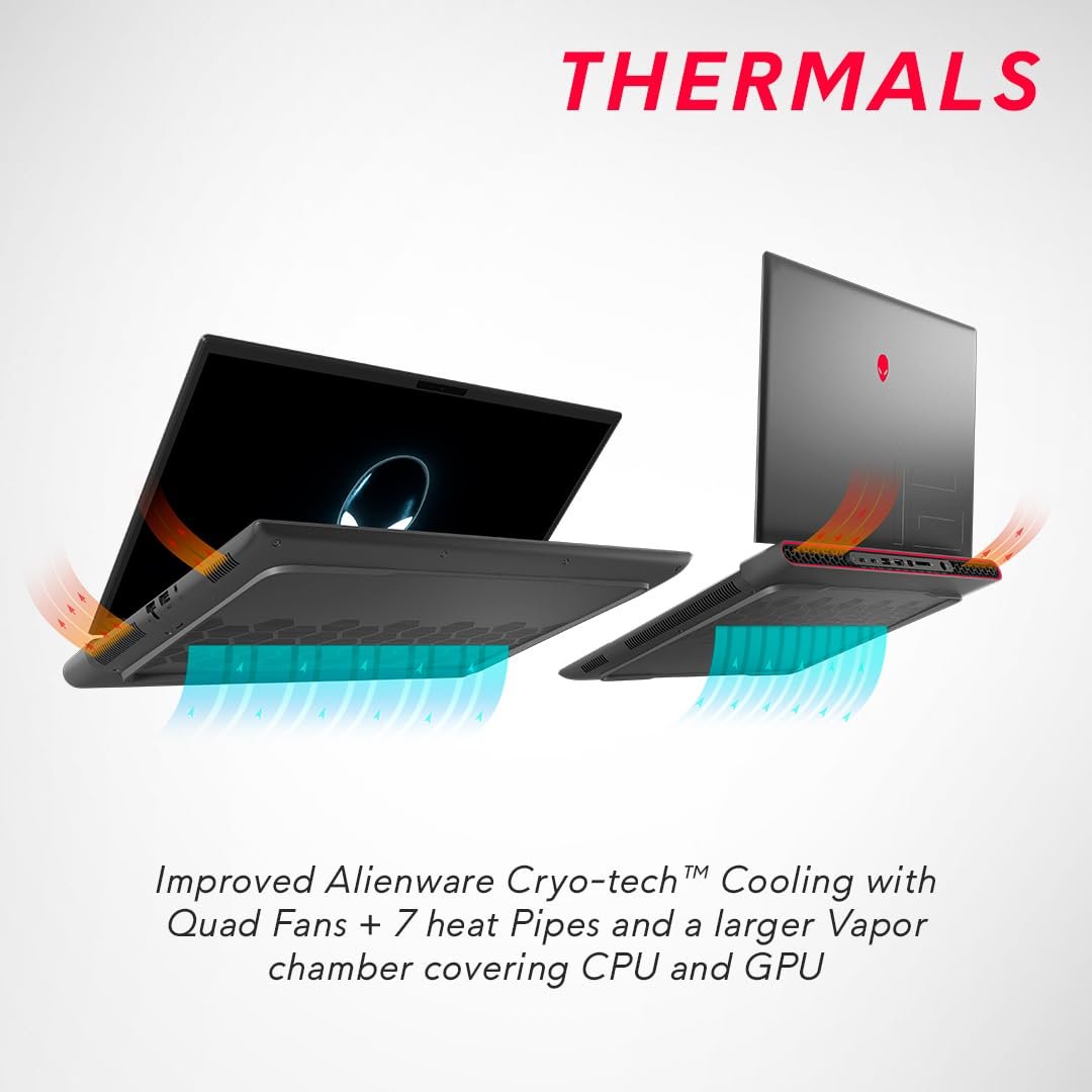 Connectivity: Qualcomm WCN6856, 2×2, 802.11ax, MU-MIMO, Bluetooth wireless card // Thermals: Improved Alienware Cryo-tech Cooling with Quad Fans + 7 heat Pipes and a larger Vapor chamber covering CPU and GPU