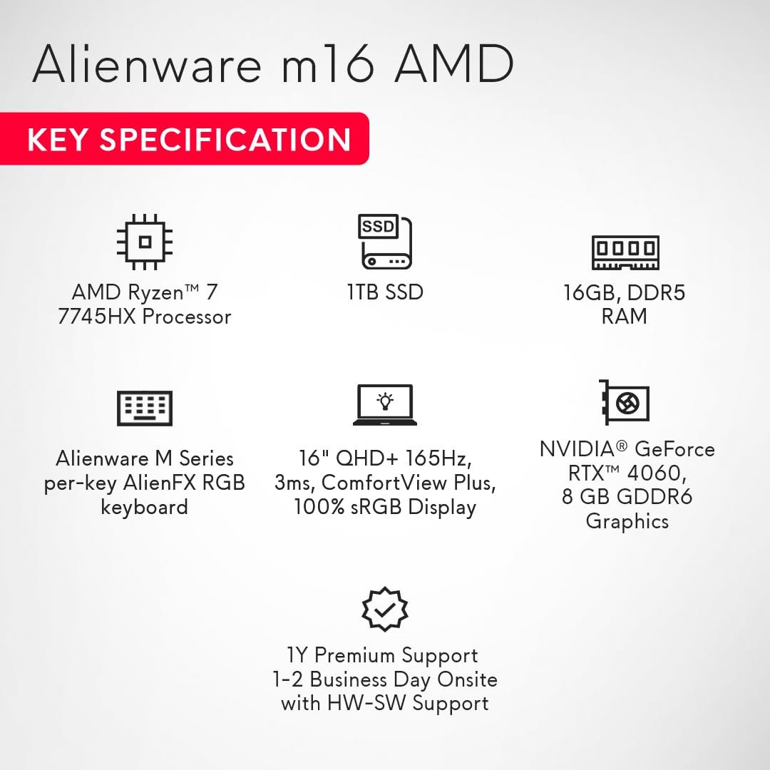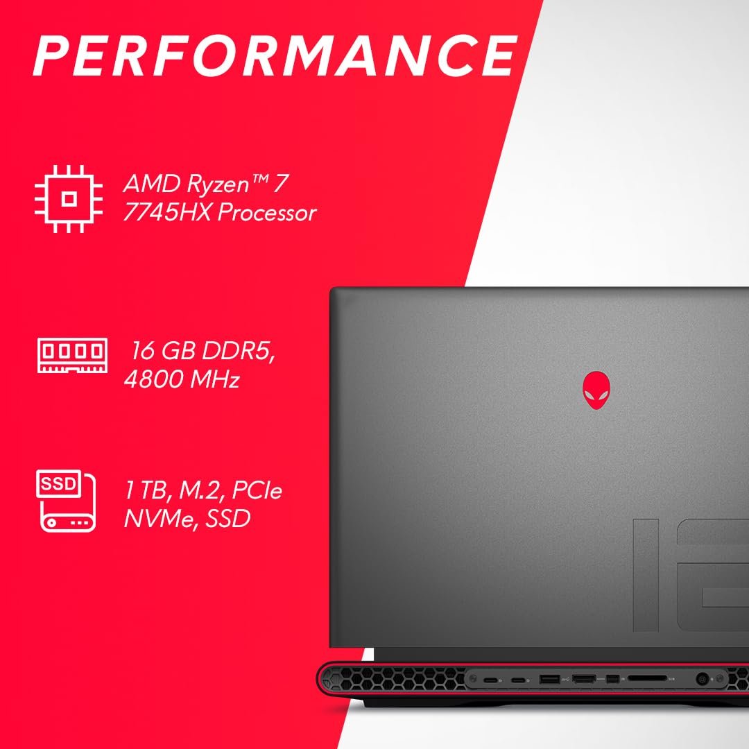 Dell Alienware m16 Gaming Laptop, AMD Ryzen 7-7745HX/16GB DDR5/1TB SSD/16 (40.64cm) QHD+ 165Hz, 3ms, 100% sRGB/NVIDIA RTX 4060, 8 GB GDDR6/Win 11 + MSO’21/15 Month McAfee/Dark Metallic Moon/3.23kg