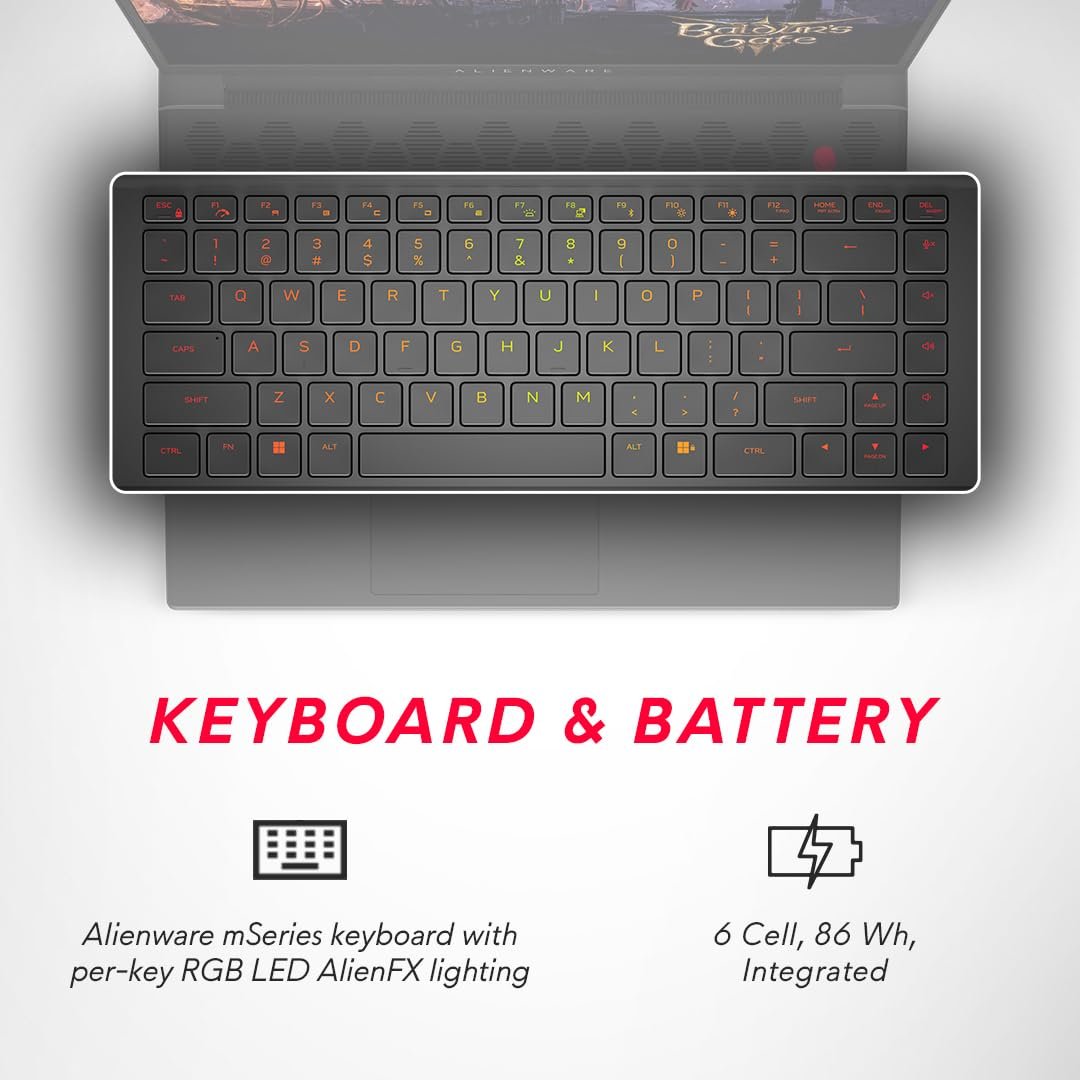 Display: 16″ QHD+ 165Hz, 3ms, ComfortView Plus, 100% sRGB // Graphics: NVIDIA GeForce RTX 4060, 8 GB GDDR6 // Keyboard: Alienware M Series per-key AlienFX RGB keyboard