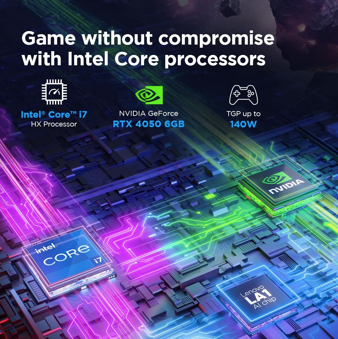 Graphics: NVIDIA GeForce RTX 4050 6GB GDDR6 Dedicated Graphics Boost Clock 2370MHz with max TGP 140W | Free-Sync and G-Sync || Cooling: Legion ColdFront Hyper innovative thermal system features fans spinning both inward, working in tandem to eciently expel hot air from the rear, ensuring uninterrupted gameplay. A dedicated hyperchamber maintains optimal temperatures, delivering 15W more power in Extreme Mode, reducing skin temperature by 2°C, and cutting noise by 2db.