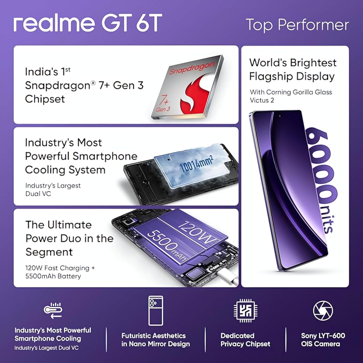 realme GT 6T 5G (Miracle Purple,8GB RAM+256GB Storage) | India’s 1st 7+ Gen 3 Flagship Chipset | 1.5M+AnTuTu Score | 5500mAh+120W | The World’s Brightest Flagship Display