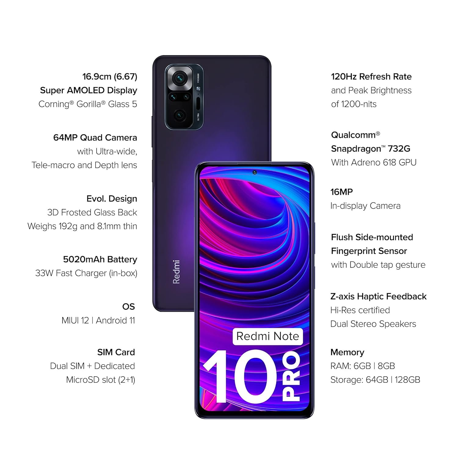 Redmi Note 10 Pro (Dark Nebula, 6GB RAM, 128GB Storage) -120hz Super Amoled Display|64MPwith 5mp Super Tele-Macro, Normal