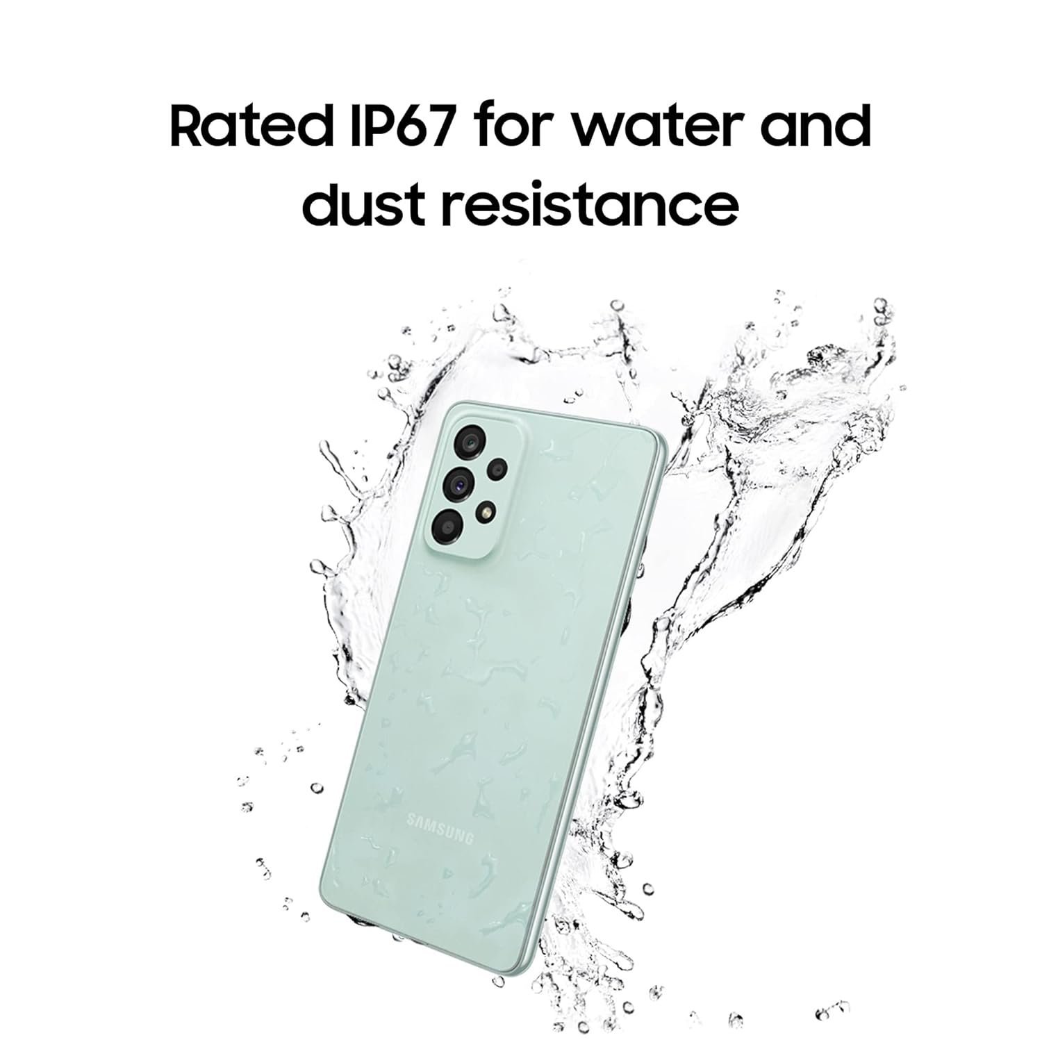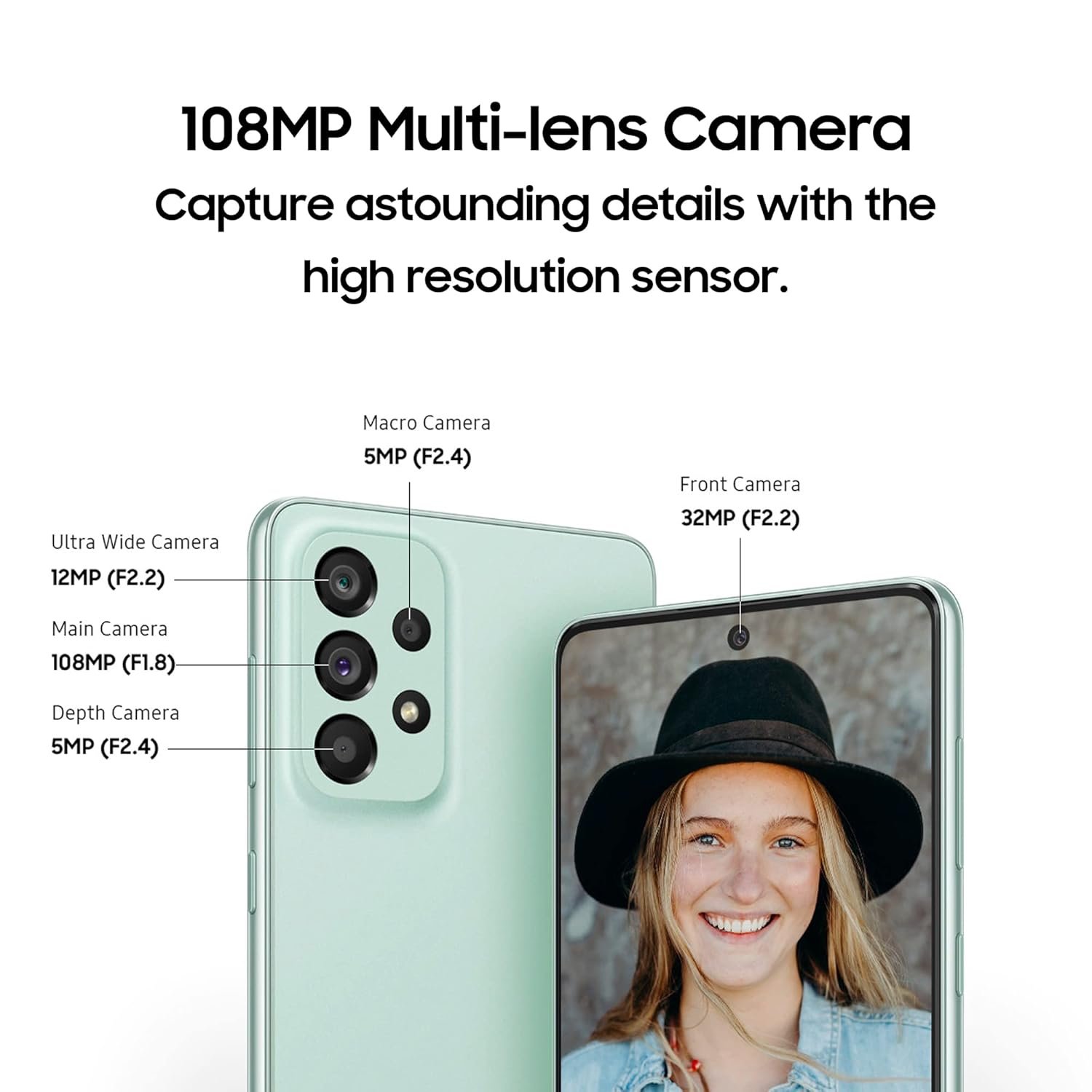 Samsung Galaxy A73 5G with 108MP Rear Camera with OIS, IP67 rating for water and dust resistance, 6.7″ FHD+ Super AMOLED+ Infinity-O Display, Super smooth screen with 120Hz refresh rate, and Powerful 2.4GHz Octa-Core Snapdragon processor